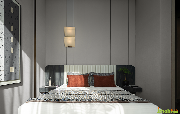 長輩房素雅矜重,溫文爾雅,方正的格局給人一種簡單的優(yōu)雅感。樣板間設(shè)計在一片素雅的底色中,低飽和度的橙色點綴出空間的平和氛圍。