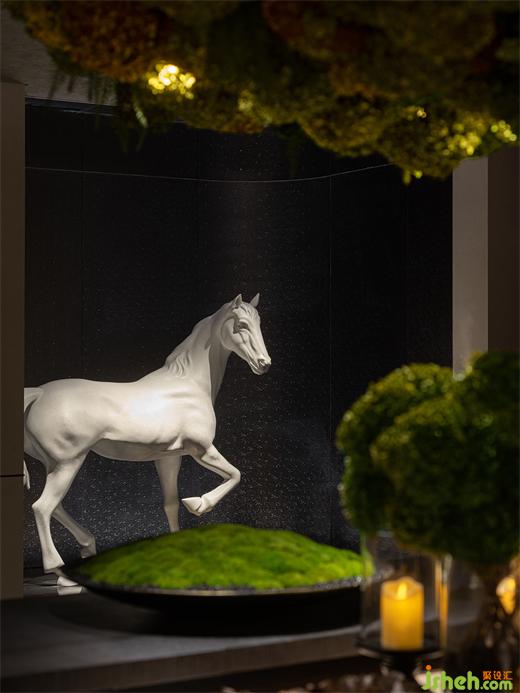 會所設(shè)計(jì)利落的駿馬雕塑豐盈了接待區(qū)藝術(shù)氣息,復(fù)古韻調(diào)與現(xiàn)代氣息在空間中交織碰撞。
