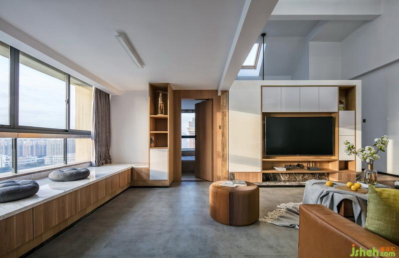 室內(nèi)設(shè)計師將原有的大陽臺與客廳打通,合并為客廳的一部分,這不僅讓客廳的會客功能強化,同時也加大了自然光線的引入,讓整個客廳空間都灑滿陽光;一面長長的飄窗,搭配著原木色書架,不僅讓整個空間洋溢著通透又休閑的氣息,也使客廳在視覺感官上顯得很開闊;這一面飄窗,讓生活多了一份愜意,在閑暇時間,看看書、喝喝茶、曬曬太陽。讓生活回歸自然,清新舒適。
