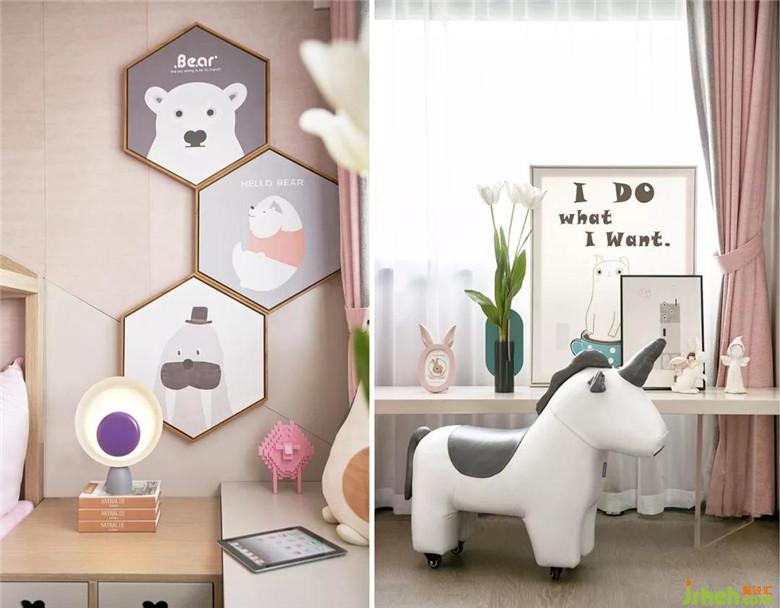 兒童房是一方夢(mèng)幻的小天地。柔和的色調(diào)似真似幻,讓人不自覺的放輕腳步??蓯鄣莫?dú)角獸,童話精靈擺件,純潔的花藝,是小主人美好的夢(mèng)中場(chǎng)景。