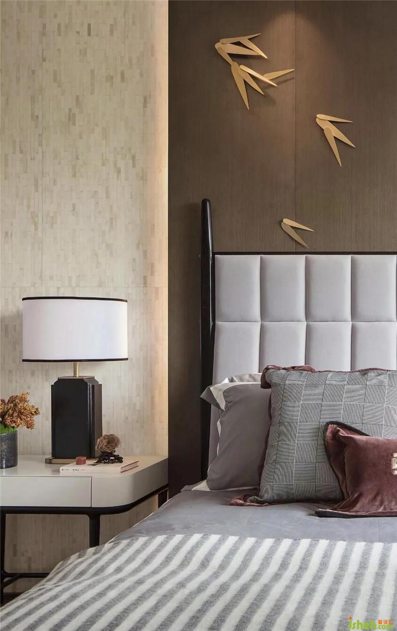 在老人房的處理上,窗前的遠(yuǎn)山景色被凝練于高低錯(cuò)落的屏風(fēng)之上,青松盆景、墻上金屬葉片自然的元素與生活的崇高詩意在此融為一體。