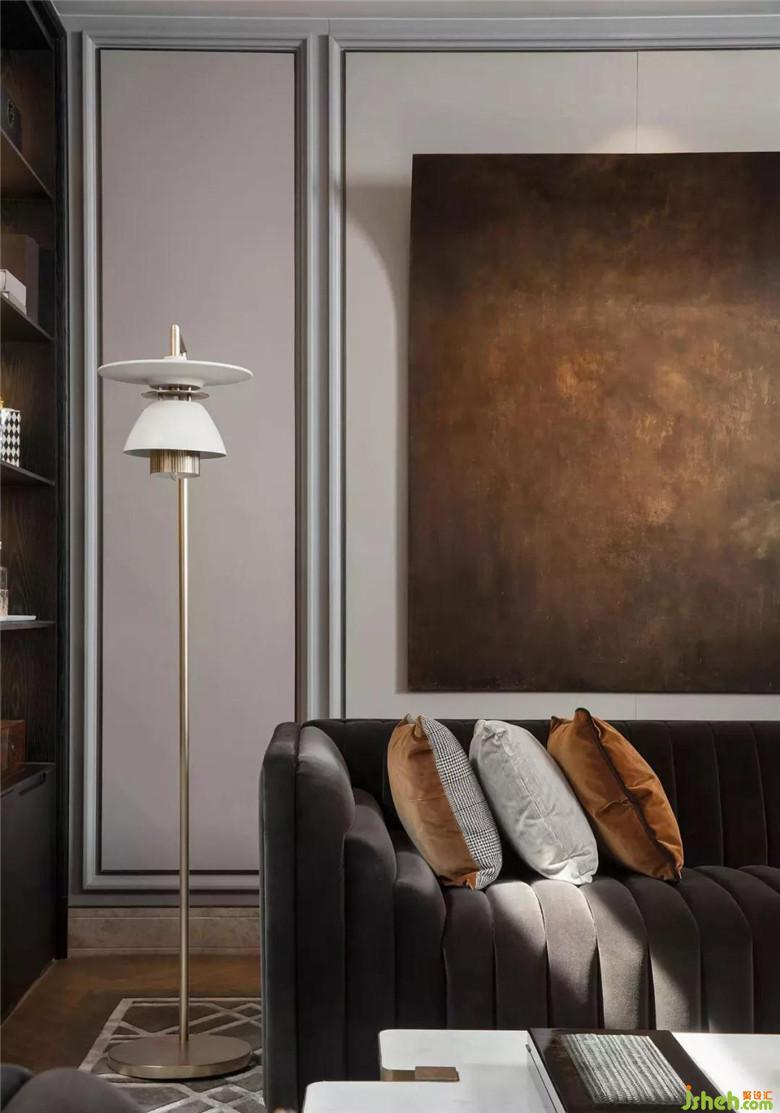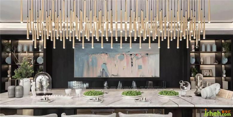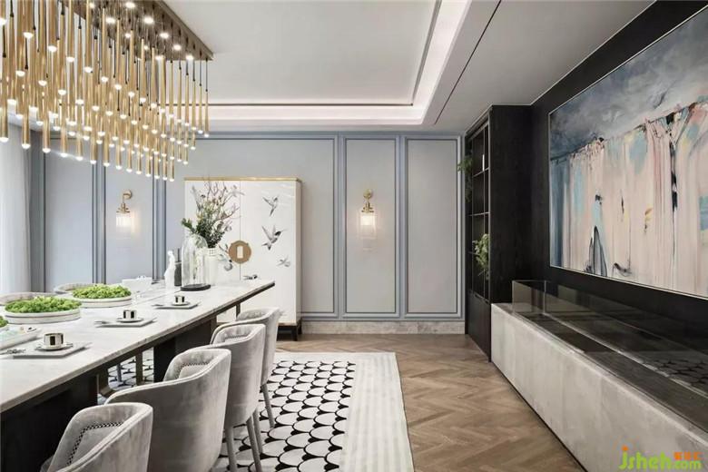 與書房區(qū)不同,線條的呈現(xiàn)方式,在女主人的下午茶空間變得溫柔了許多。從地毯的扇形拼接、線型吊燈的錯落秩序,到座椅的優(yōu)雅姿態(tài),將當代東方女性的韻味淋漓展現(xiàn)。