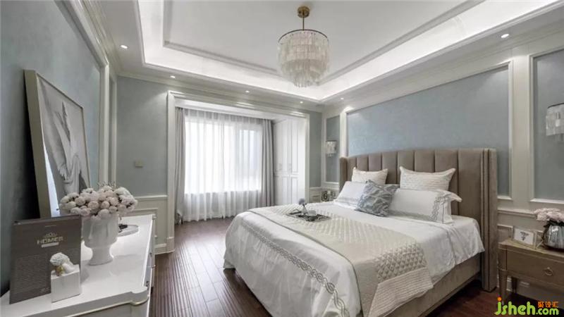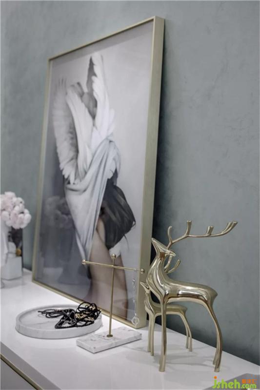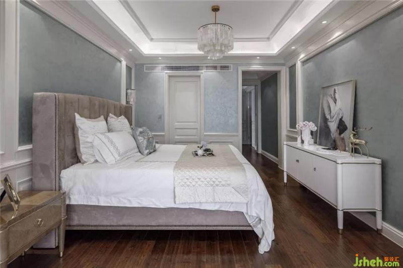 主臥整的設(shè)計(jì)采用米色護(hù)墻板及大面積灰綠色,讓整體空間時(shí)尚。主臥相對(duì)是主人的私密空間,即便如此也沒有被設(shè)計(jì)成封閉的區(qū)域,相反巧妙運(yùn)用了玻璃打造整個(gè)家的通透感,以靈活的簾子作為遮光或暫時(shí)阻斷視線之用。地面采用木地板,增添臥室的暖意,壁畫擺件再次呼應(yīng)整體空間的用色風(fēng)格。