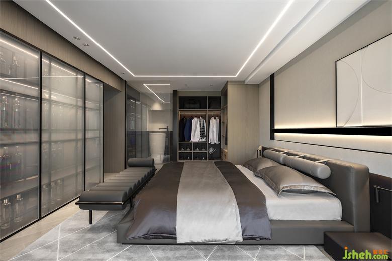樣板房設(shè)計臥室設(shè)計動靜結(jié)合,對整個二層空間進行合理的劃分,減少生活中流動線路的紛擾。空間內(nèi)線與塊的結(jié)合溝勒出時尚的魅力,無主燈使得空間設(shè)計簡約整潔,而射燈的燈光又滿足各功能區(qū)域的光源需求,使得空間純凈舒適,有序歸整。軟裝表達上將灰色發(fā)揮到極致,糅合比例到最佳,點綴藍色KAWS,營造簡約奢華的風格,同時空間線條的深淺疊加,使空間深邃富有質(zhì)感。使得空間深邃且富有質(zhì)感。
