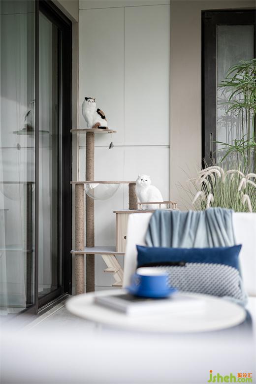 樣板間設(shè)計(jì)開放式欄桿的陽臺可以更好的親近大自然,藍(lán)與灰的張力撞擊也加深著陽臺空間的質(zhì)感印象,讀書、休閑、逗貓,享受來自大自然帶來的寧靜閑暇。