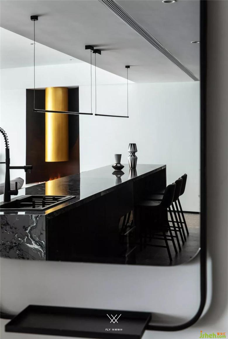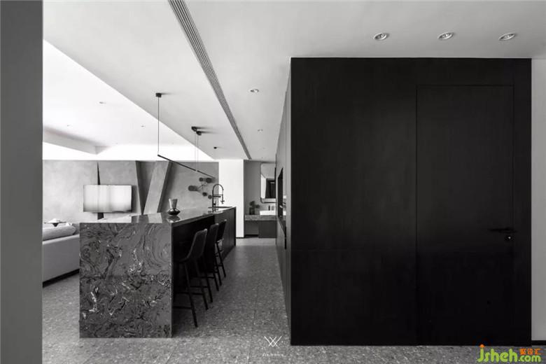 吧臺式的餐廳與客廳相鄰,鋪之以開放式的西廚空間,可以拉近居住者們的距離。水磨石的地面、極簡的餐桌造型,都流露出最質(zhì)樸的魅力。
