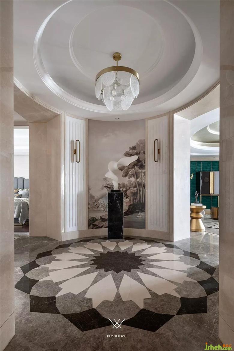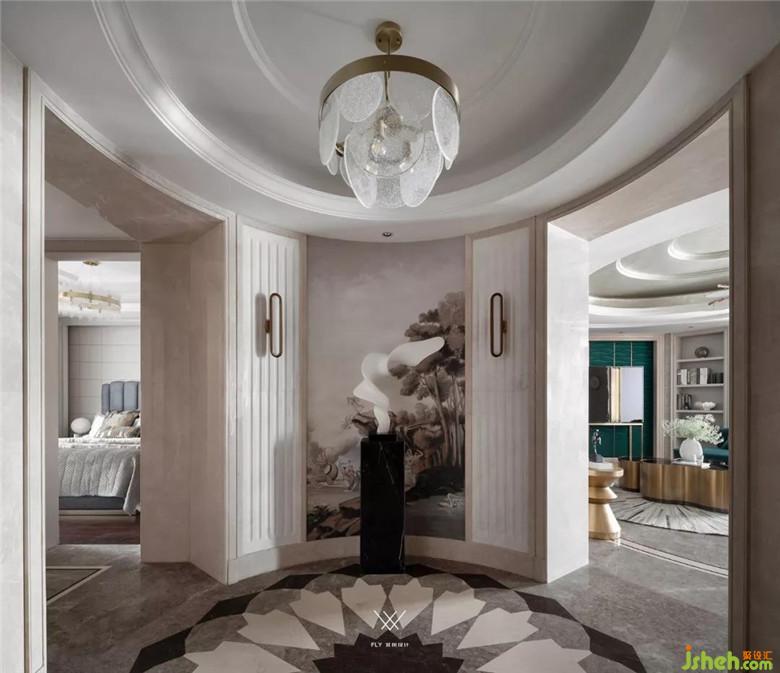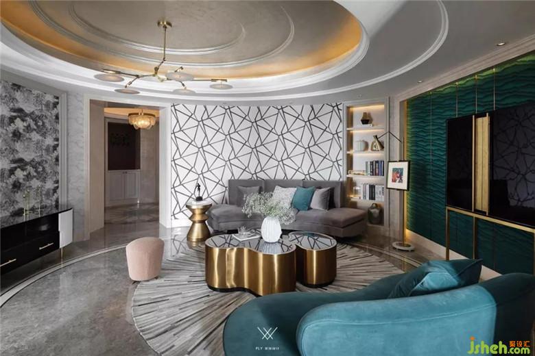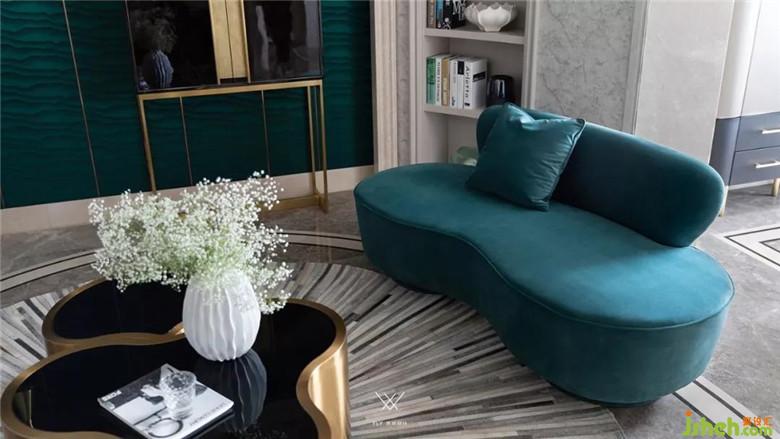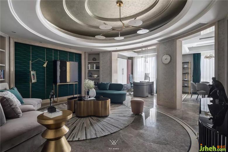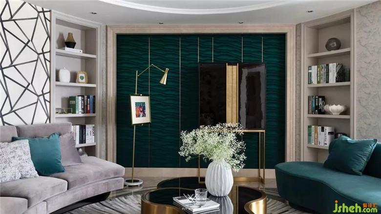 客廳不僅僅承載其自身的功能,而且還是連接餐廳、書房的樞紐。所以為了體現(xiàn)出既有整體又有分散,更多以一種聚合的形式出現(xiàn),我們摒棄了常規(guī)的家具擺法,通過異形沙發(fā)和組合茶幾營造一個圓形的圍合氛圍。原有的硬包、墻紙款式和色調(diào)過于沉悶保守,更換墨綠色墻紙與主背景的硬包款式,在色彩上和家具貫穿起來。
