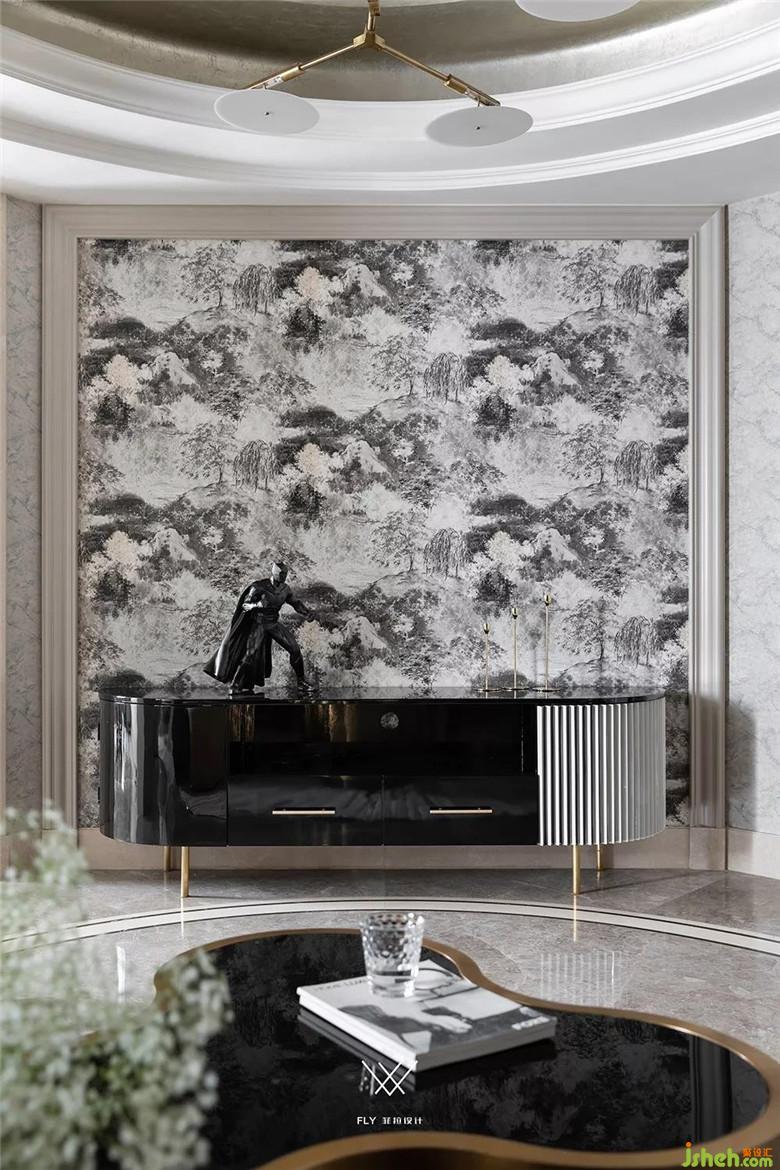 我們整體的軟裝改造是根據(jù)它的六要素家具、燈具、窗簾、地毯、掛畫、飾品進行重新規(guī)劃??梢娍筒蛷d頂部造型的雜亂,墻面大面積的墻紙紋理復(fù)雜,造成了它完全沒有營造出需要的效果。所以改變墻面裝飾,在不破壞原有硬裝結(jié)構(gòu)的基礎(chǔ)上進行改善。