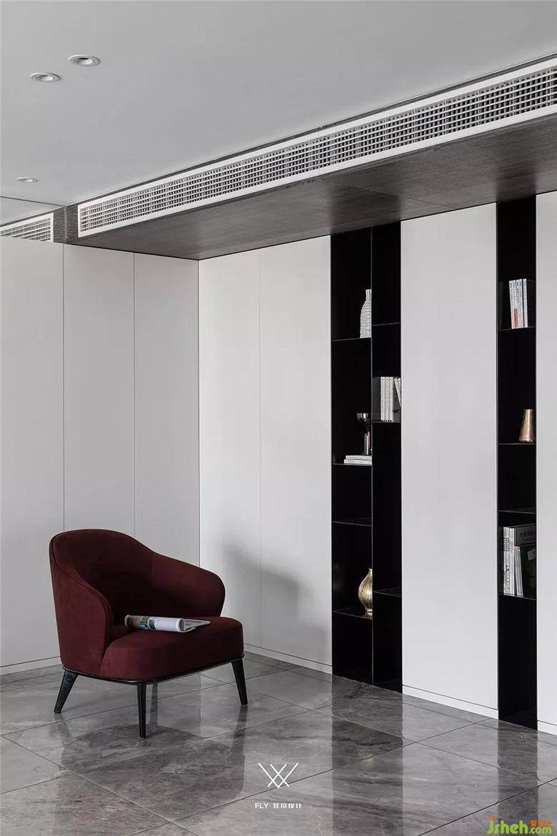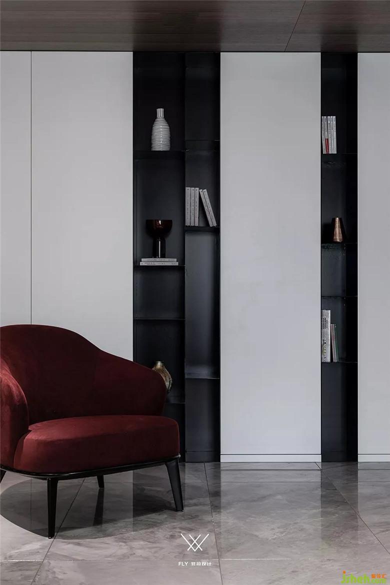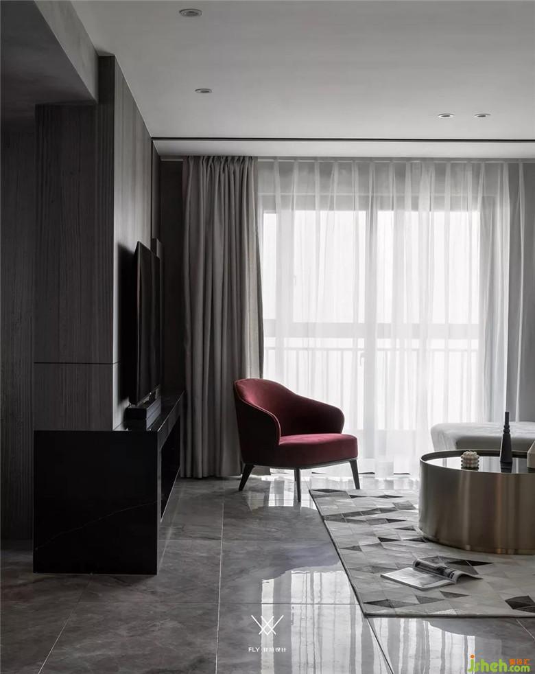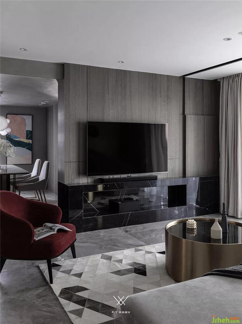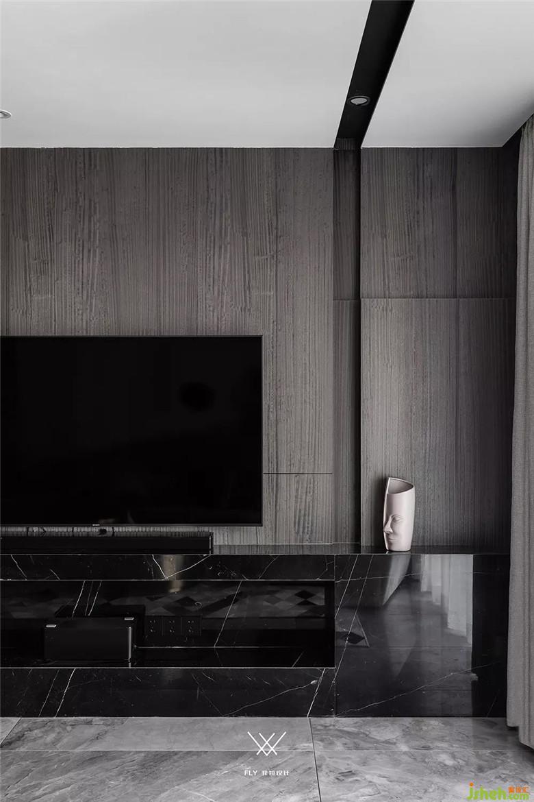 如果看設(shè)計圖的話能夠看到電視機(jī)在背景墻的三分之一處。主要原因是沙發(fā)背景墻和電視背景墻長度不一樣,放在這個位置能夠讓電視的中軸線和沙發(fā)中心相同,看電視更舒服。電視背景右邊多余的部分用凹槽加上高低不平的塊面去處理,讓這部分不會顯的突兀。