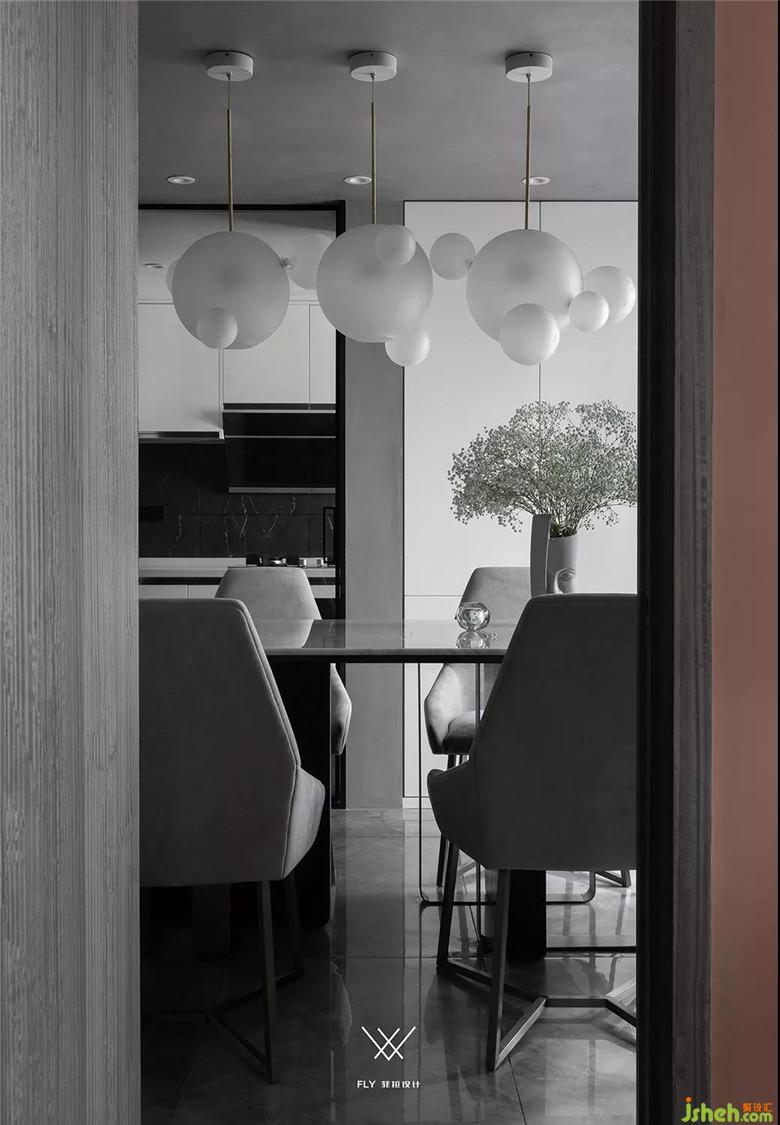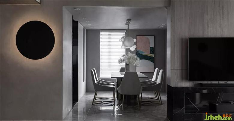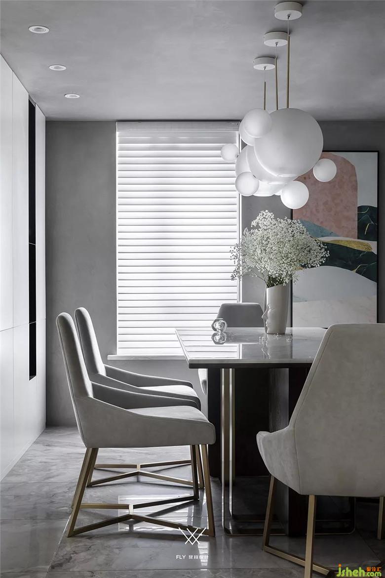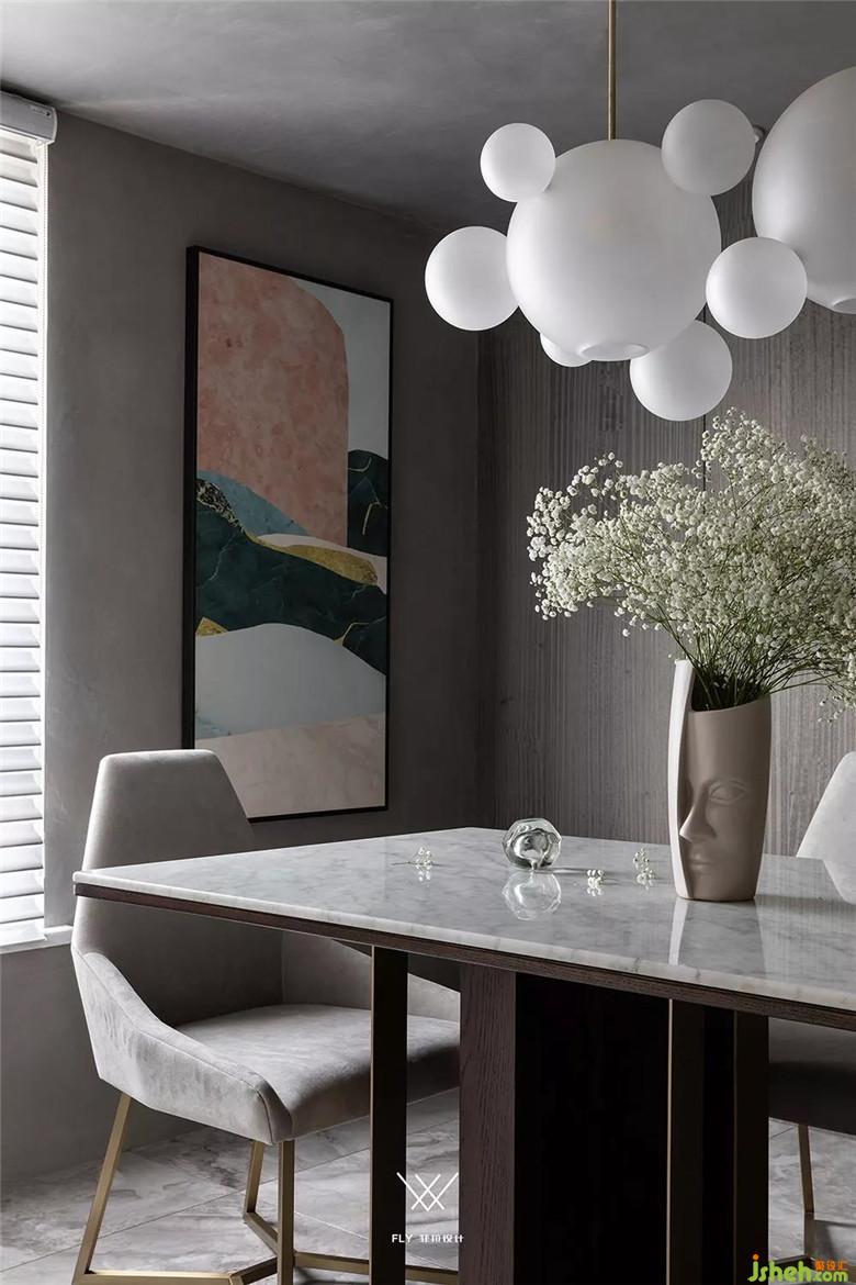 餐廳頂面和玄關(guān)用的是同一款藝術(shù)涂料,可以讓兩個(gè)區(qū)域更加整體。這種材質(zhì)的紋理非常細(xì)膩,在餐廳從窗戶進(jìn)來的自然光線照射下更出色。
