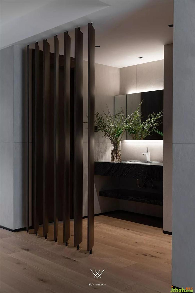 屏風作為渲染主題的風格,再合適不過,透露著隱約的美。在屏風閉合時可以看做餐廳背景結(jié)構(gòu)的一部分,同時有和實體墻不一樣的立體感,可以跟著自己的心情調(diào)整屏風開合。打開時干區(qū)會若隱若現(xiàn)的露出來,加大部分空間和餐廳的聯(lián)系,而且畢竟干區(qū)也是屬于衛(wèi)生間的一部分,用屏風將這部分隱藏,也保證空間的通透。