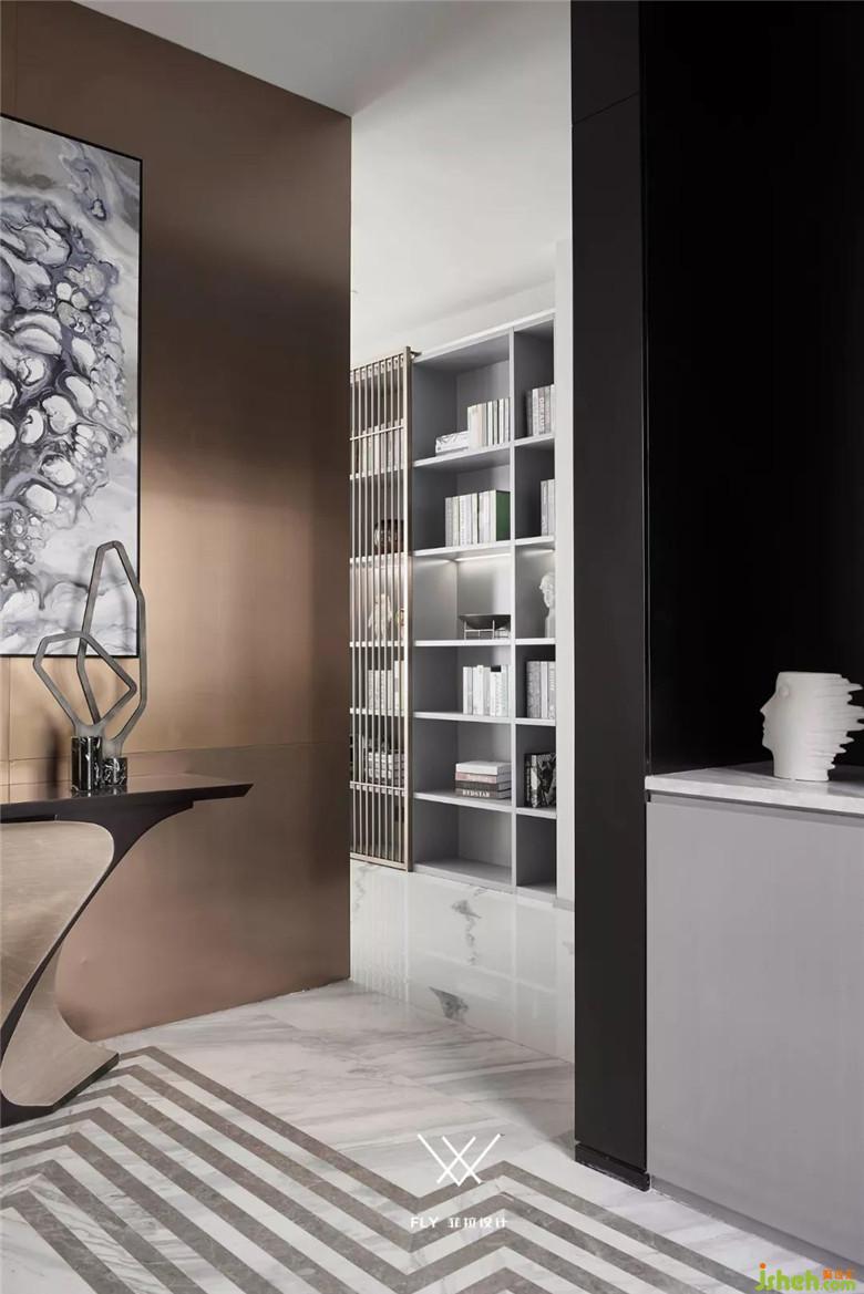 入戶后通過(guò)可旋轉(zhuǎn)的橄欖形立柱使玄關(guān)與客廳渾然一體,利用旋轉(zhuǎn)的立柱可以任意調(diào)節(jié)玄關(guān)與客廳的視角,這既強(qiáng)調(diào)了玄關(guān)的獨(dú)立性又能讓玄關(guān)與內(nèi)部產(chǎn)生更多的互動(dòng),而且增加了虛實(shí)相生的趣味性。