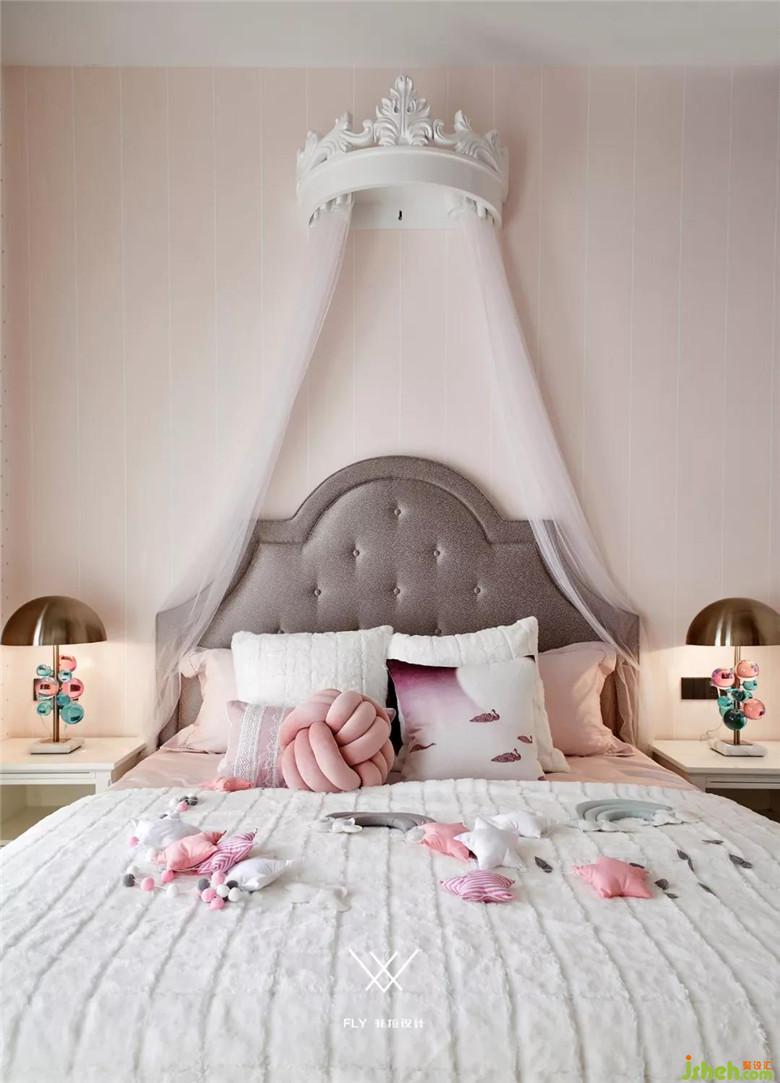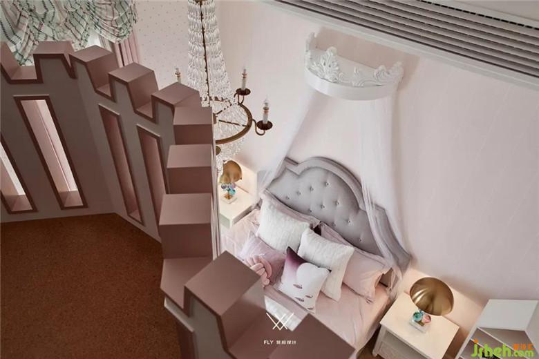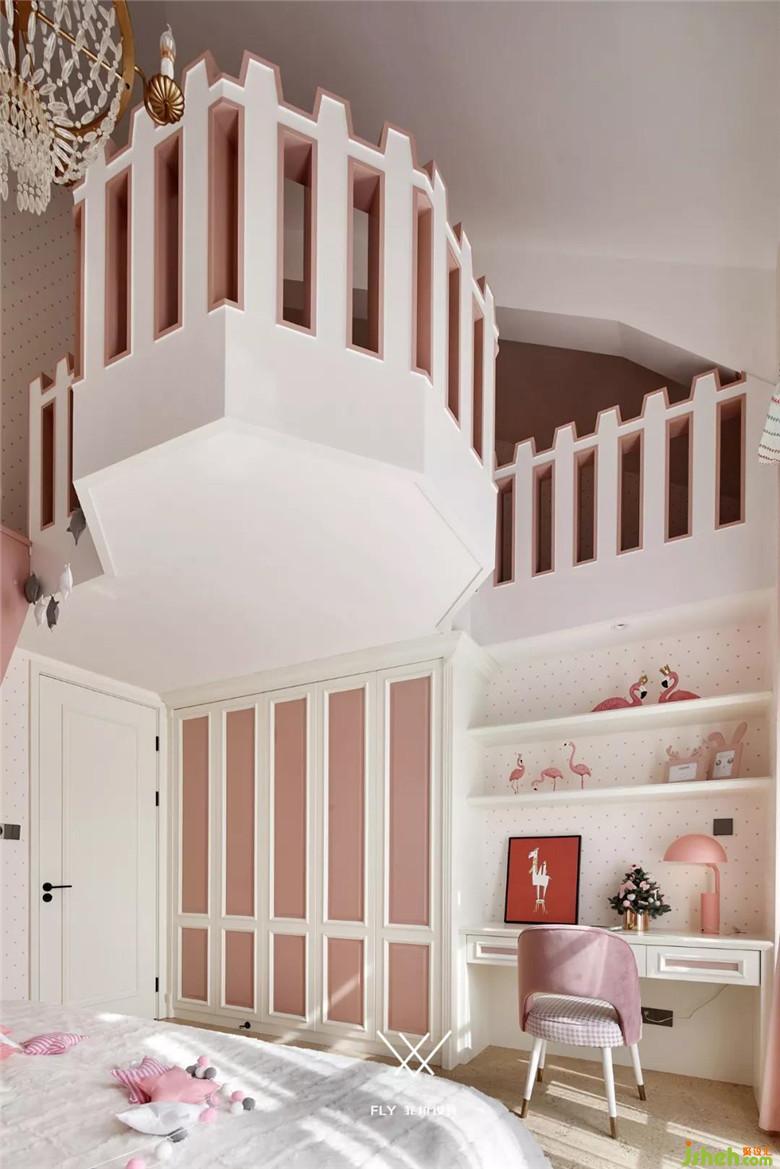 女孩房整體使用了馬卡龍色,不同層次的低飽和度淡粉、淡黃、薄荷綠進行疊加組合,粉色波點壁紙鋪滿整屋十足的公主范,閣樓圍欄設計靈感源自城堡,這個是屬于個人不可侵犯的空間。