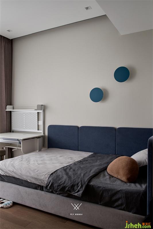 舒適的生活色彩越入孩童房屋,不易被遺棄的空間著色,在元素上也是力求潔簡而童趣曼妙,圓盤、動物地毯,弧形元素的包容與溫和,唱和著兒童所在階段的爛漫與遐想,亦然把握著成長歷程的審美變化尺度。