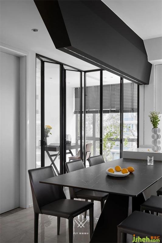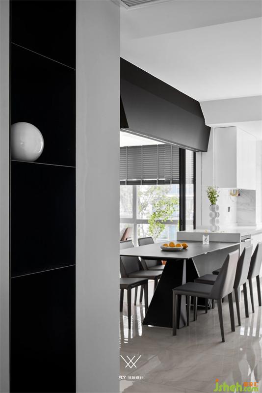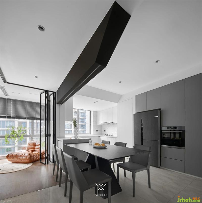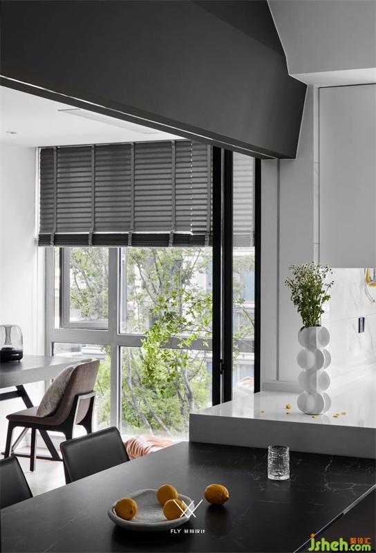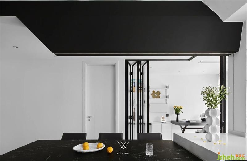 吝色黑白灰,破而重組的開闊,空氣里光的振動(dòng)隨之翩翩;開放式廚房、半開放式書房,流動(dòng)的空間給予的讓步,餐邊柜默念著禮貌加入的詞根。