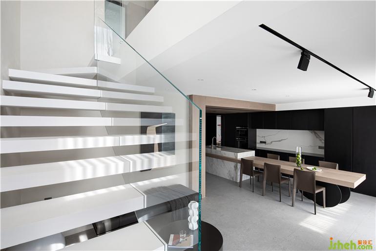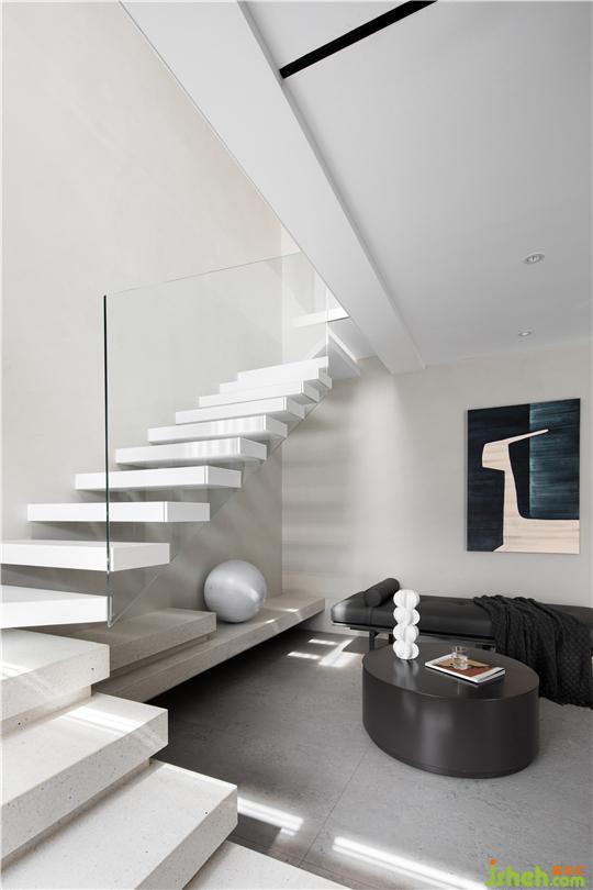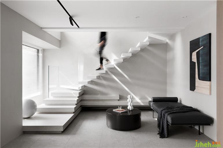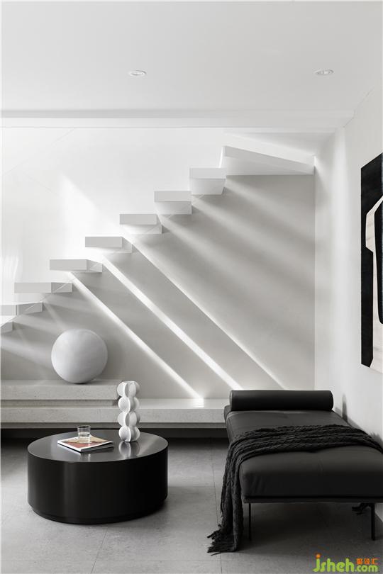 杭州復(fù)式設(shè)計(jì)打破傳統(tǒng)樓梯認(rèn)知,從“礙事”工具梯一躍成為整個(gè)空間最具視覺語言的主角。每階獨(dú)立成塊嵌入墻體,伴隨著上下兩層窗外灑進(jìn)的豐盈光線,陽與陰、明與暗、光與影的互動(dòng),階梯視覺上的漂浮狀與拾步而上的踏實(shí)感,神圣、浪漫又自在。