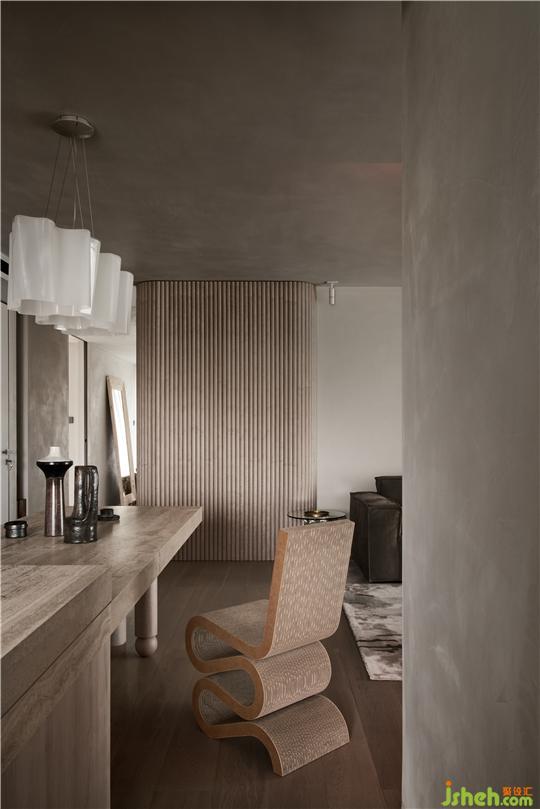 大面積使用溫潤自然的木皮,洞石營造自然質(zhì)樸的空間感受,暗紅色的單椅和裝飾畫營造視覺中心點(diǎn)、打造溫潤、平和的輕侘寂美學(xué)。