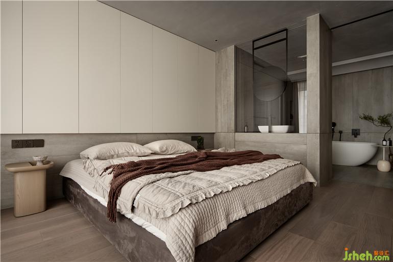 改變動(dòng)線,相鄰臥室改為開放式書房并作為主臥入口,原入口部分納入衛(wèi)生間與衣帽間,空間優(yōu)化,舒適度提升同時(shí)客廳也保持一個(gè)更為完整的狀態(tài)。主臥床頭背景做聯(lián)排儲(chǔ)物柜,設(shè)計(jì)柜門作為背景造型延伸,增強(qiáng)儲(chǔ)物隱藏其功能性更為干凈、和諧。