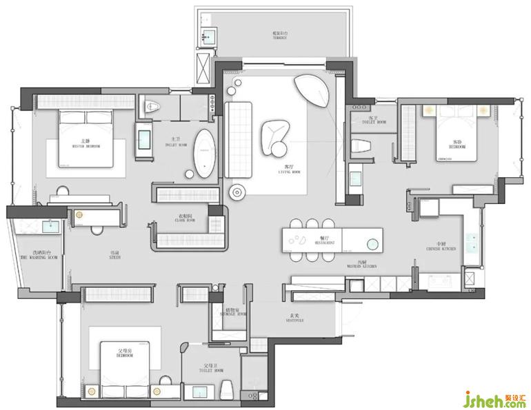 因?yàn)槭且粋€(gè)人居住的狀態(tài)不受限制,開放式書房非但不會(huì)被打擾情況,反而可以獲得更多的空間交流與與光線共享。