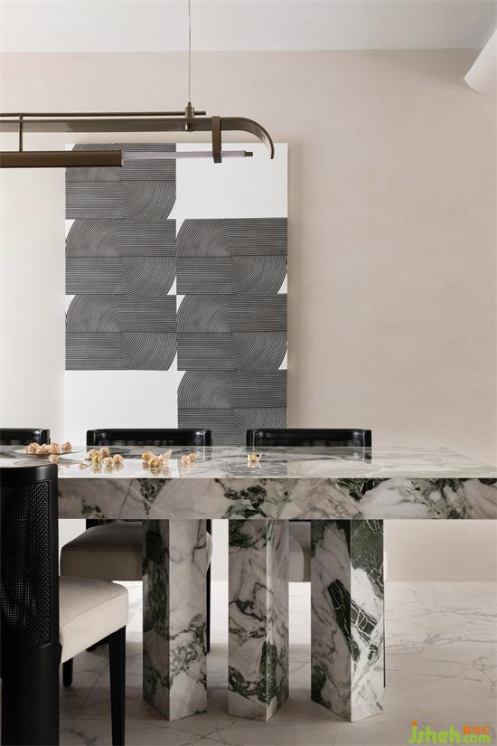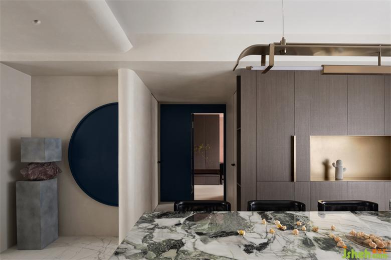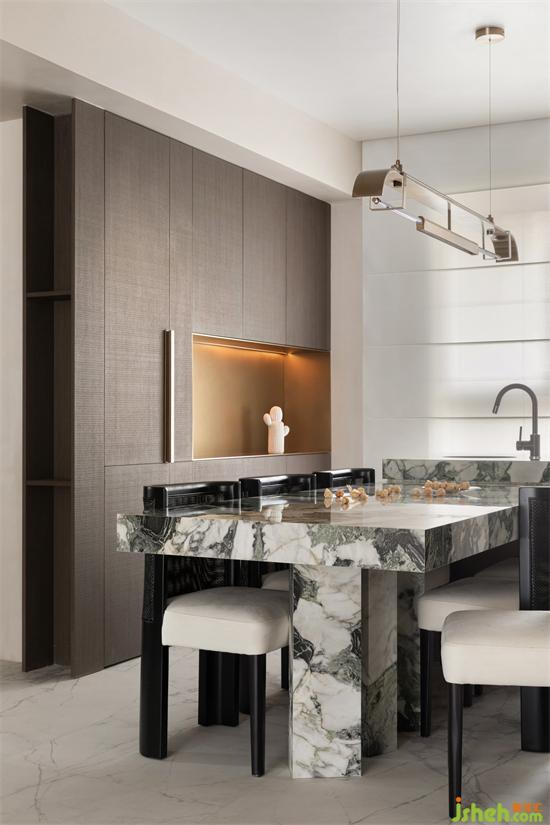 毗鄰餐廳的客衛(wèi)后移,為餐邊柜留出空間強化室內設計師餐廚的收納功能;納入島臺元素,為家居生活方式提供更多的便利性。