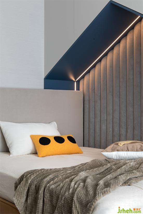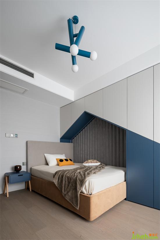 以藍做分色打造小男孩的童趣空間鄰兩面墻放置床體,保證兒童活動空間的寬敞幾何造型與收納空間結(jié)合,豐富家居生活的趣味疊排精裝房改造性