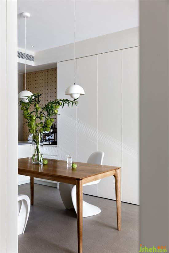 純凈的空間氣質(zhì)之下,藏匿著節(jié)制與力量,半開放式廚房以極簡(jiǎn)的立面勾勒,極為富余的操作臺(tái)面應(yīng)答煙火生活的實(shí)在與飽滿。用度有致的空間色彩之下,可見蒙德里安格子畫元素,理性的空間里有著細(xì)微處的點(diǎn)點(diǎn)熱浪。