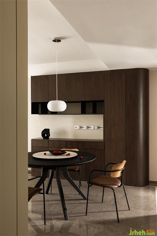 基于女主人的喜好,室內(nèi)色彩游走于大地色系之中,空間色調(diào)協(xié)調(diào)統(tǒng)一,杭州和寧文華府裝修設(shè)計(jì)墻面與軟裝配飾結(jié)合棕色系,黑胡桃色作點(diǎn)綴加持空間質(zhì)感。