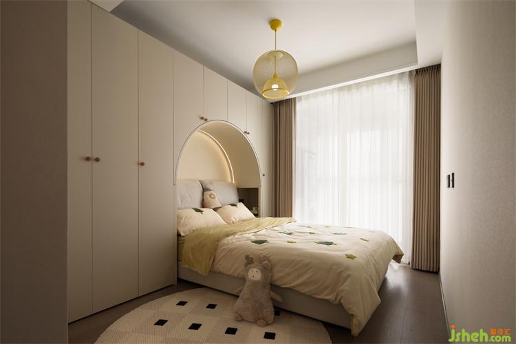 高收納需求與床頭背景造型結合,杭州和寧文華府裝修設計打造兒童房的專屬趣味,在元素上的細化斟酌,期待給予孩子更多的關照與呵護。