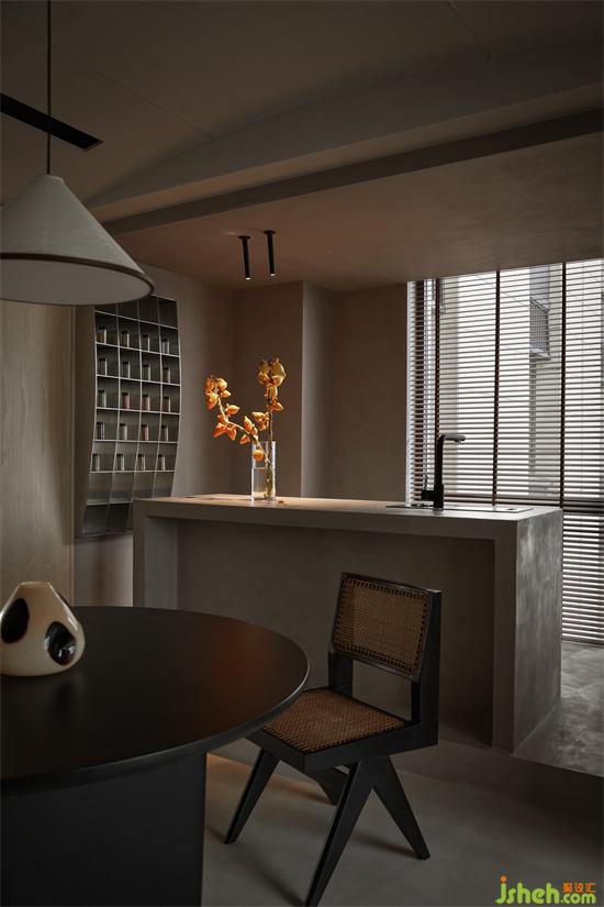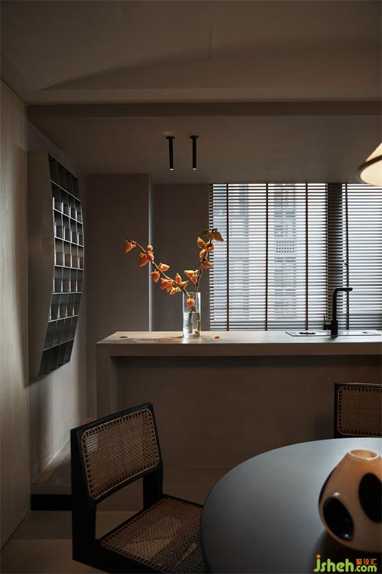 思考各個空間的功能分配,寧波江山萬里精裝房改造將西面小陽臺納入餐廚區(qū)為其賦能,提高餐廳實際使用的功能性與舒適度,增加西廚島臺 咖啡吧的功能,且對墻面與地面色彩進行區(qū)分配給,強化區(qū)域的體塊感與儀式感。