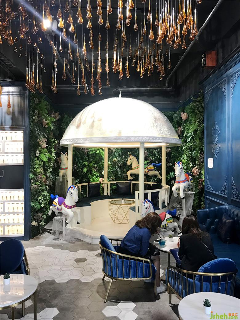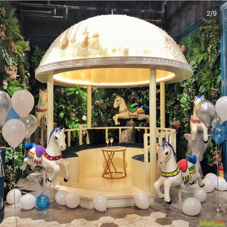 中間是一個(gè)高腳杯的展示區(qū),通過燈光的照耀下,顯得格外高檔,拍照凹造型真的太適合不過了。后面的旋轉(zhuǎn)木馬亭子,加上墻身的綠植,給到客戶一種森林夢(mèng)幻的意境,讓人不想離開這里。
