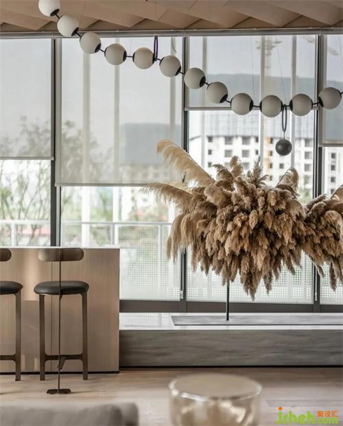 焦黃的葦草是自然的縮影。懸于窗邊的葦草藝術(shù)裝置成團(tuán)成簇,武漢售樓處設(shè)計(jì)高級(jí)灰色調(diào)再度詮釋了極簡(jiǎn)主義的克制美學(xué)。形隨風(fēng)動(dòng),佇立于空,像極了經(jīng)典的印象派畫(huà)作。