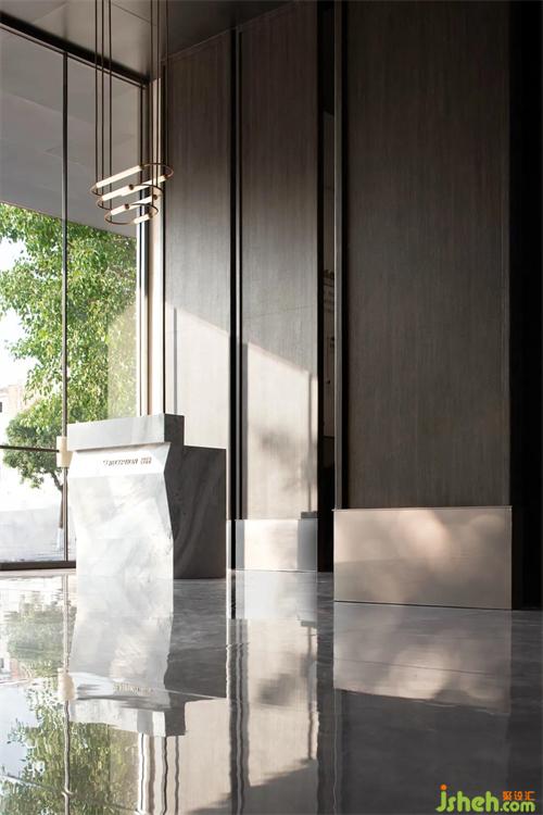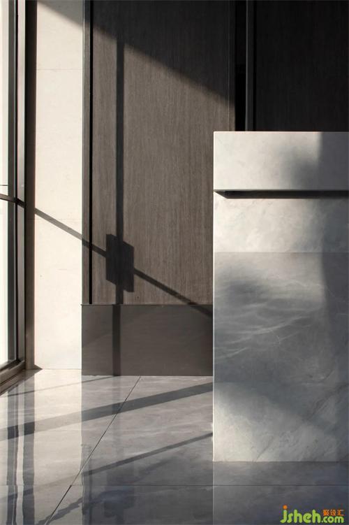 售樓處入口的接待大堂,是一個(gè)擁有沉靜安寧氣場(chǎng)的空間,而在這個(gè)灰色調(diào)的空間中,一塊完整的山水紋大理石如同山水長(zhǎng)卷般在空間中心徐徐展開,它和極簡(jiǎn)的大理石肌理構(gòu)成了接待臺(tái)的全部體量。