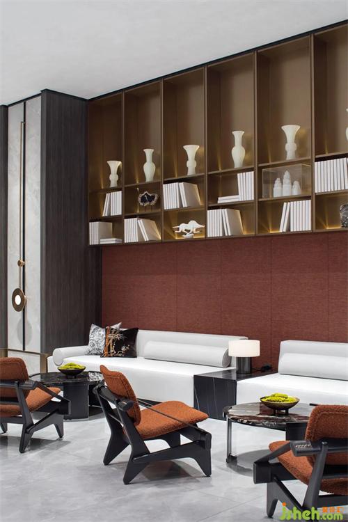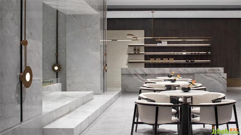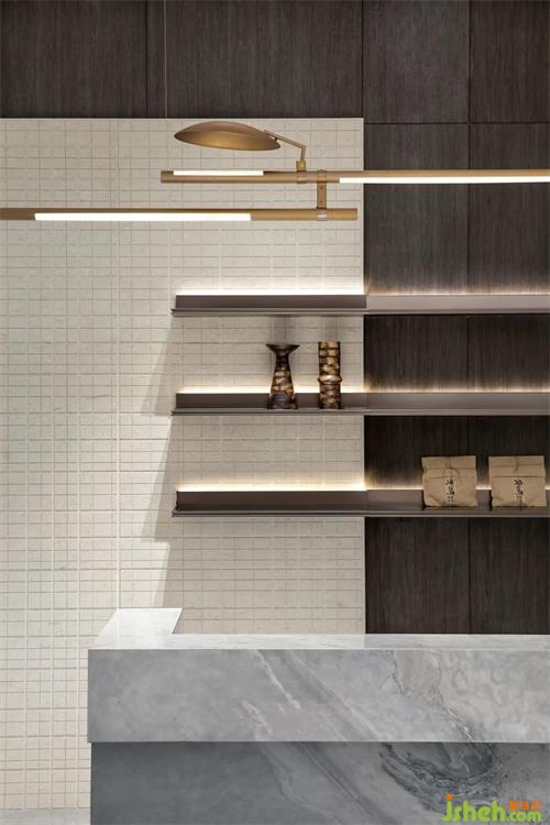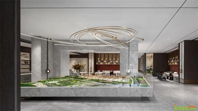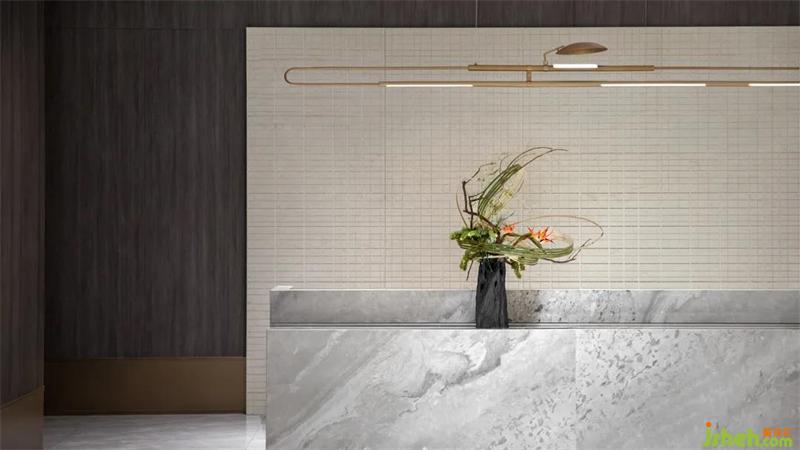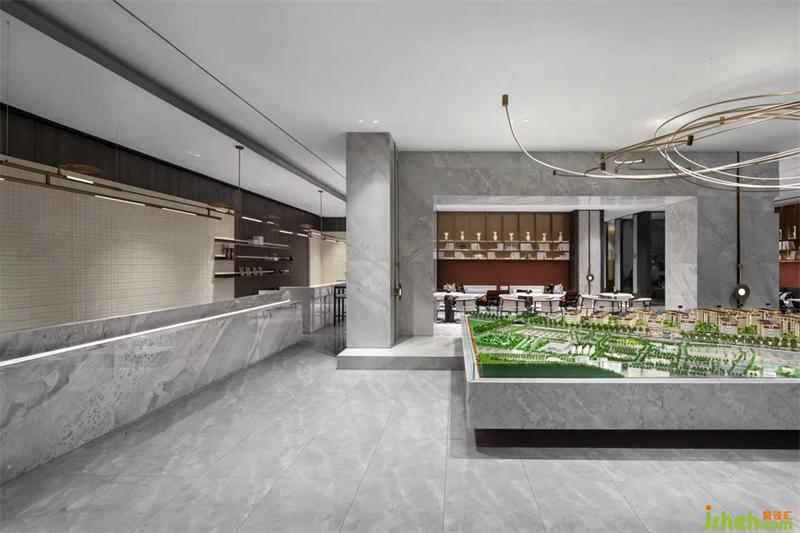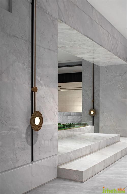 沙盤區(qū)與洽談區(qū)以大理石中空墻面隔斷,看似隔斷,更像是一幅框景,泉州售樓處設(shè)計(jì)大理石肌理成為空間的視覺輸出焦點(diǎn),在現(xiàn)代空間的洗練下,將新東方人居美學(xué)娓娓道來。