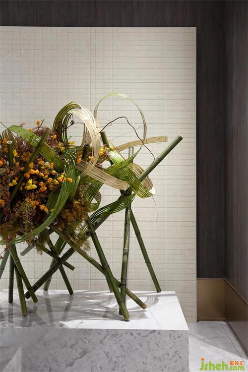 水吧臺(tái)上點(diǎn)綴的插花充滿了自由、舒適、鮮活的生命力,在高級(jí)灰的水墨背景優(yōu)雅與俏皮并存。