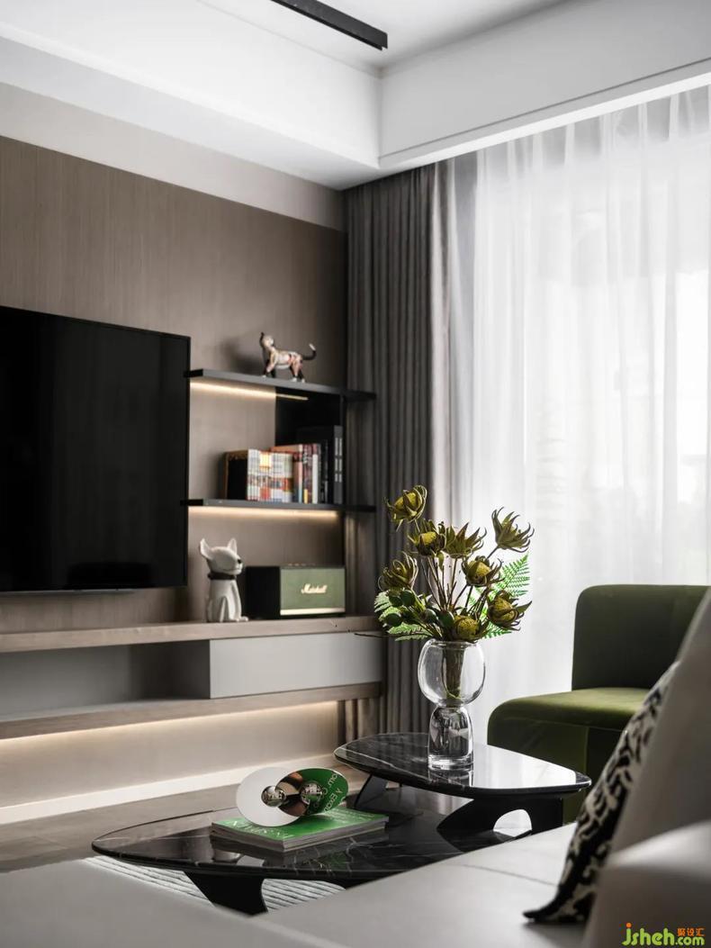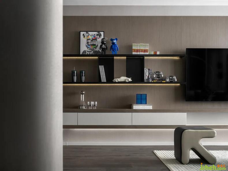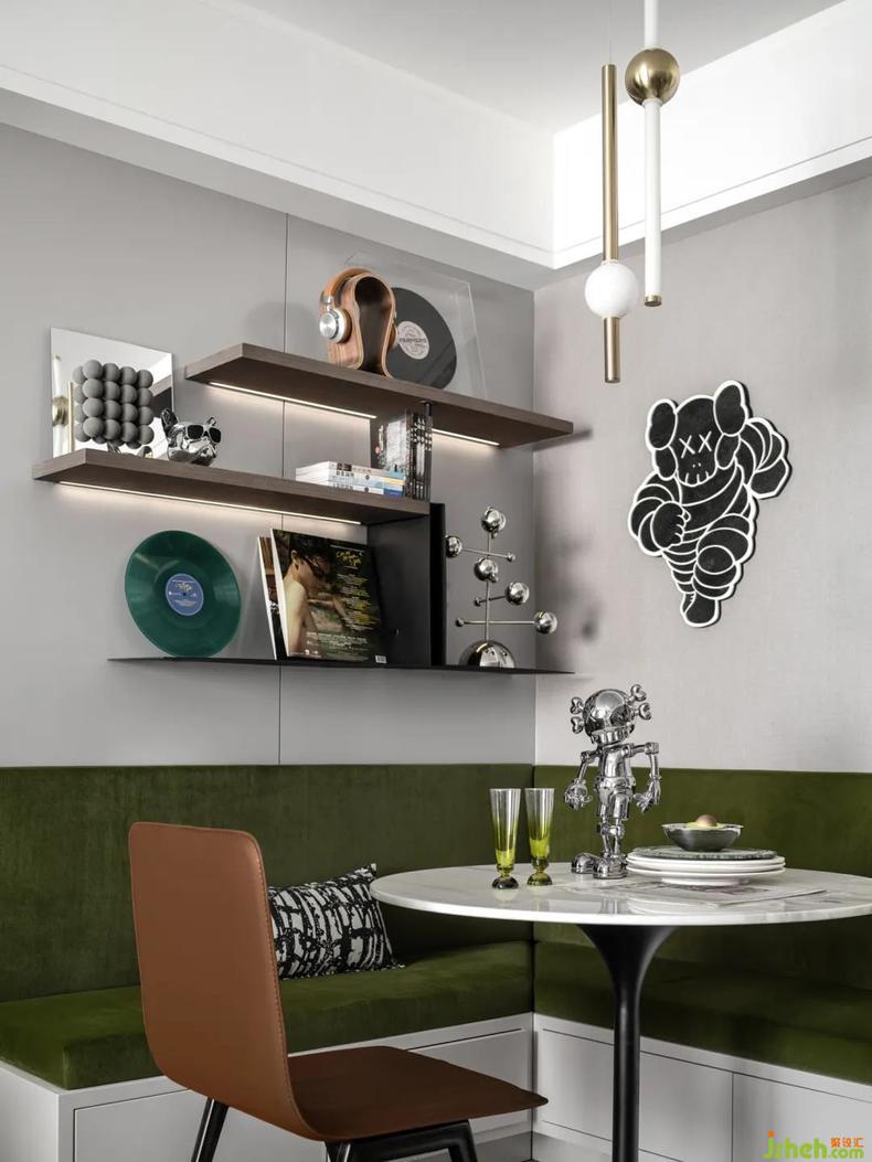 B戶型的設(shè)計(jì)通過模擬潮玩者每天每個(gè)時(shí)段的生活狀態(tài),以及所匹配到的空間氛圍,貫穿整套戶型的軟裝邏輯線索。整個(gè)空間在雅灰的鋪敘下,綠意的渲染中,皮革材質(zhì)的應(yīng)用以及深淺色彩的對(duì)比,增加了更多的空間品質(zhì)細(xì)節(jié)。舒適的皮質(zhì)主沙發(fā)配備大理石紋理的造型玻璃茶幾,多元肌理的木質(zhì)墻上放置最鐘愛的手辦和潮玩書籍。精準(zhǔn)的比例把控和寧?kù)o理智的色系搭配,樣板房設(shè)計(jì)彰顯主人個(gè)性的同時(shí)展露出對(duì)品質(zhì)與格調(diào)的不懈追求,讓人身處起居空間松放情緒,療愈煩。