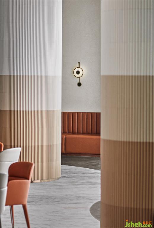 立柱的漸變處理,利用小石材的豎向拼接,將豎向陣列元素延續(xù)到底。宛如中國畫般,時而流動,時而聚集,創(chuàng)造更趣味的空間體驗。