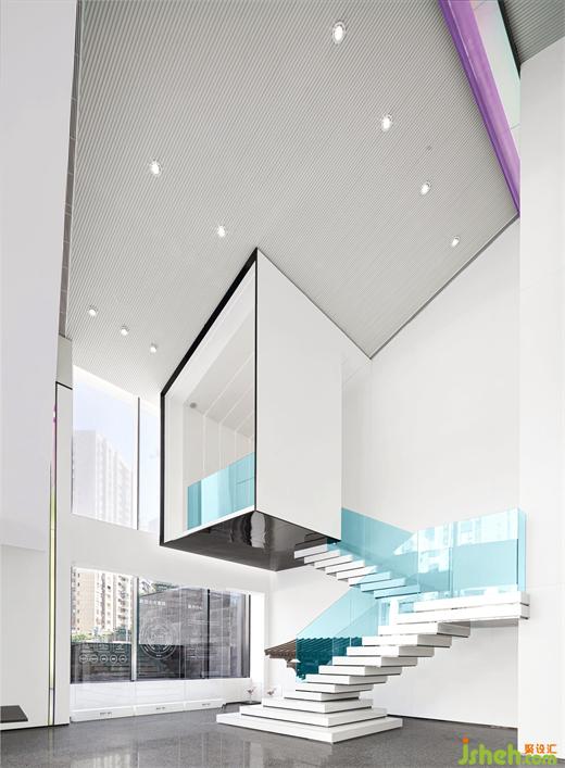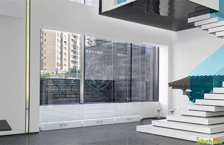 將品牌墻做的電子玻璃的材質(zhì),在時(shí)尚感與科技感兼顧的同時(shí),保證了功能的使用,同時(shí),引景入內(nèi),讓該區(qū)域景觀、建筑與室內(nèi)的通透性得到了最優(yōu)解。