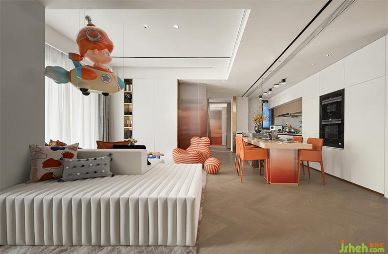 雙面可坐臥的沙發(fā),讓空間的利用率變得更高,潮玩飾品的點(diǎn)綴,凸顯了主人對(duì)樂(lè)玩生活的堅(jiān)持。融餐廳空間進(jìn)入客廳,加強(qiáng)了擴(kuò)寬空間的極致概念。