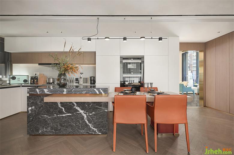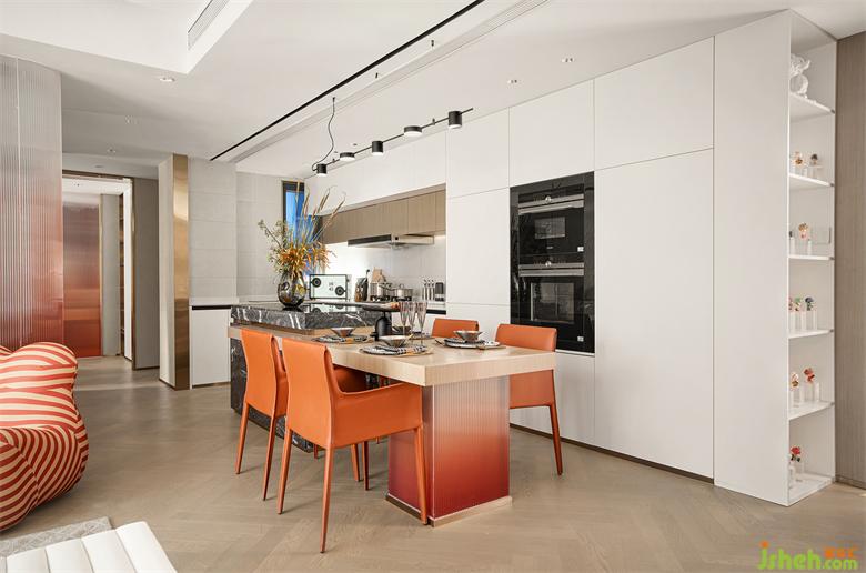 樣板間設(shè)計(jì)開(kāi)放的廚房,讓需要長(zhǎng)時(shí)間待在餐廳的人,不被空間所割離,讓任何活動(dòng)是能被看到,能被關(guān)注到的,同時(shí),隨時(shí)的互動(dòng)可能也讓交流更暢快,陪伴更輕松。家的關(guān)系因空間更為融洽合理。