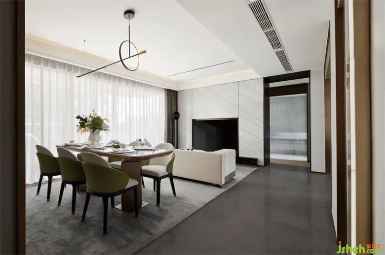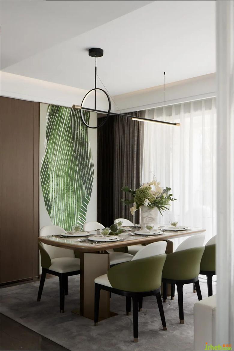 開放式的客餐廳,樣板房設(shè)計(jì)根植于理想主義與藝術(shù)美學(xué),寬大落地窗和植物配合,最大化地呈現(xiàn)空間之間的互動連通關(guān)系,并依靠一面陽臺實(shí)現(xiàn)室內(nèi)外的聯(lián)動,引導(dǎo)自然與生活相互融合。