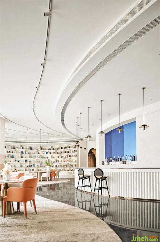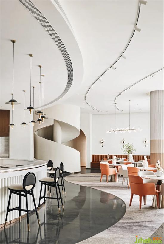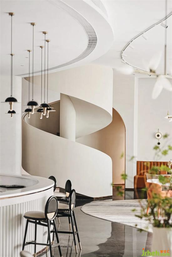 從一樓通過(guò)旋轉(zhuǎn)的樓梯進(jìn)入負(fù)一層的清吧區(qū)域,曲線的流動(dòng)婉轉(zhuǎn),在這里變得更為奇妙,弧度的變化,重慶售樓處設(shè)計(jì)讓人在通行間轉(zhuǎn)換心情,一旋一景,720度螺旋,將物化景、將景幻物。