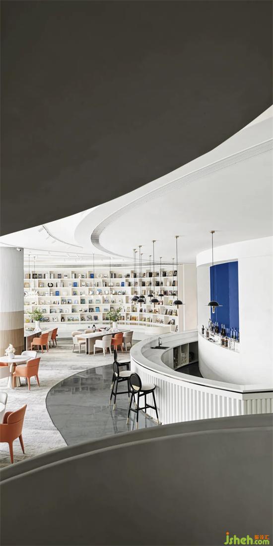 在負(fù)一樓清吧區(qū)域,色彩會(huì)更加的年輕活躍。隨意可落座的蜿蜒階梯書吧,配合不同形式的洽談桌椅,重慶售樓處設(shè)計(jì)營造出豐富的空間層次,充滿質(zhì)感的皮革,純凈的花藝與綠植,在開闊的空間內(nèi)形成平衡量感,充滿自然與現(xiàn)代文明的和諧秩序之美。