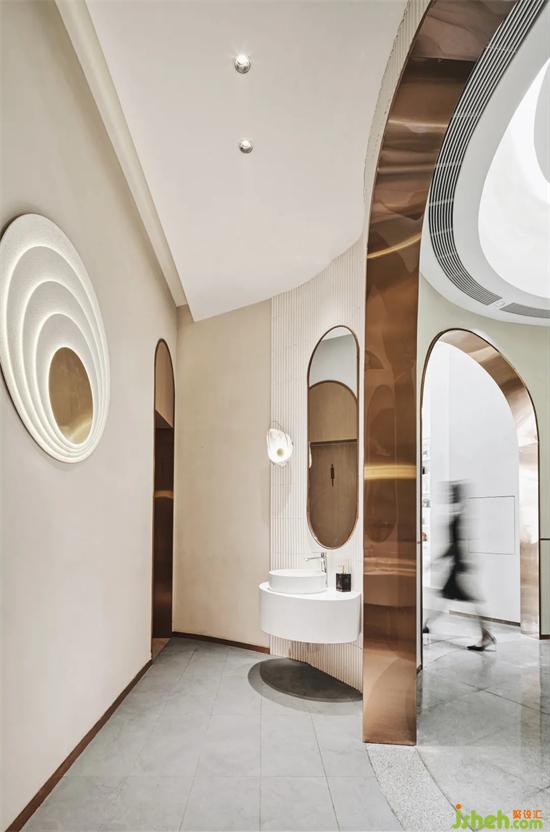 如同從墻面悄然長出來一般的吧臺(tái)區(qū),和建筑的生長異曲同工,利用材質(zhì)本色與重新編排所呈現(xiàn)的肌理,重慶售樓處設(shè)計(jì)將抽象的語匯記敘在這座建筑輪廓里。一層層迭代的浪花天頂?shù)奶幚?,蜿蜒?yōu)雅,延續(xù)無盡的“春意”,通過空間與人的互動(dòng)產(chǎn)生新的碰撞。