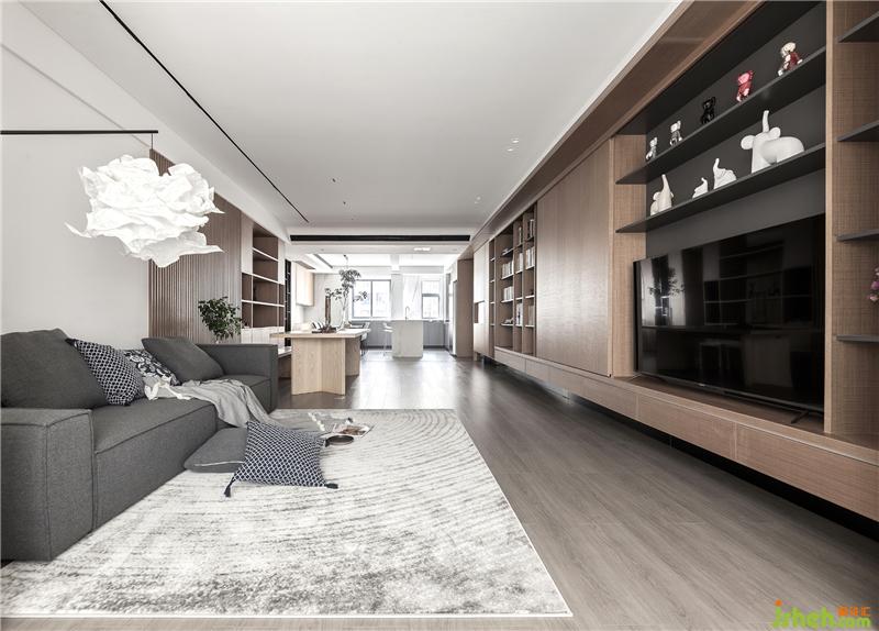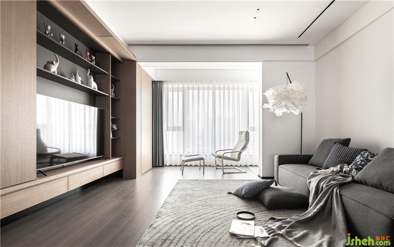 懸空的電視背景墻很好地平衡了進門視線的穿透性與私密性,同時下方的整排抽屜柜讓鏤空的臺面得以保持整潔廈門室內(nèi)設(shè)計。