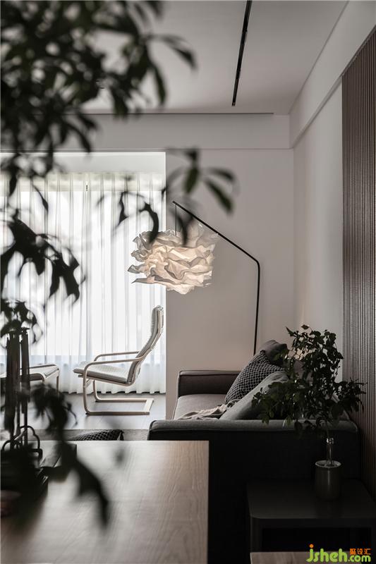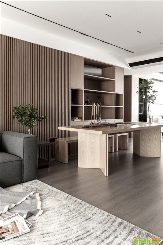 以木柵格板為背景的開放式客廳之中,四面皆可坐的沙發(fā)成為客廳的中心,形成一個環(huán)繞式動線,黑白灰之中舒適的卡其色是家中的主色調(diào),簡單而不平庸。
