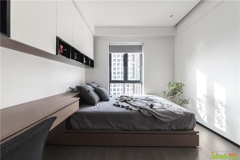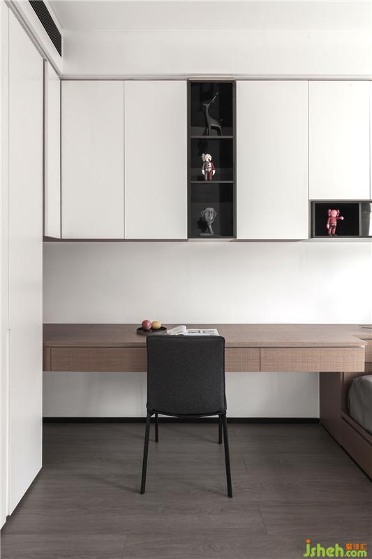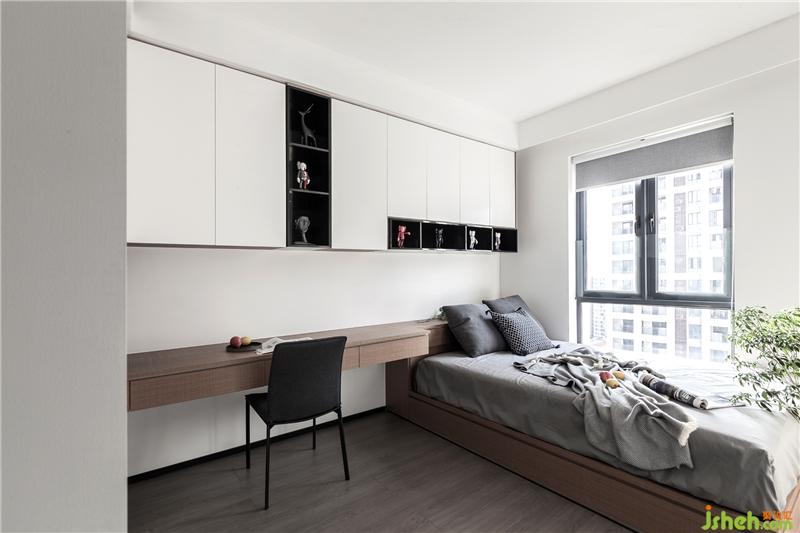 次臥室純白空間是小孩的房間,床貼柜的形式讓桌后空間更加寬裕,衣服存放、書本收納,看書寫作業(yè),休閑玩?!?統(tǒng)統(tǒng)滿足。