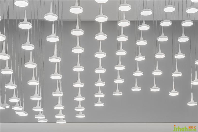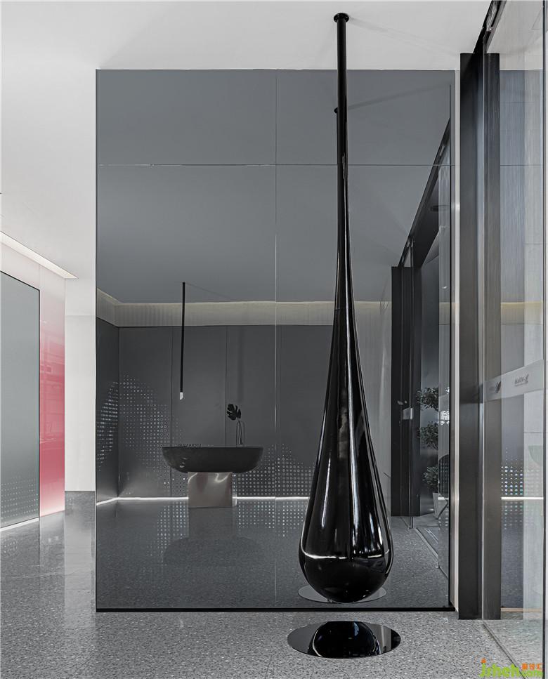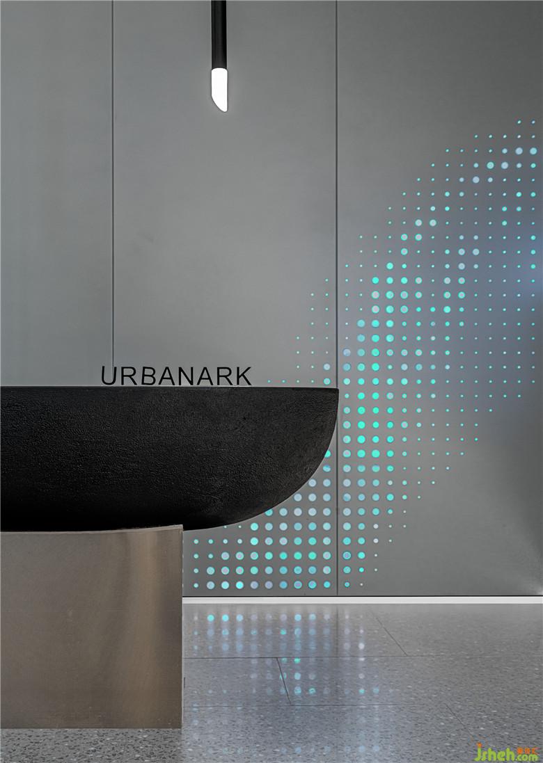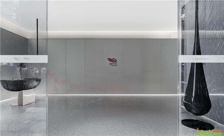 營銷中心的前廳狹長,灰白色的主色調(diào)令空間輕盈別致。前臺(tái)布置簡潔凝練,借助鏡面延展了視野,穿孔鋁板及變色燈帶幻變出漸變效果?,F(xiàn)代主義意蘊(yùn)的滴水雕塑,凝固了最有張力的瞬間,提升了整個(gè)門廳的藝術(shù)趣味。