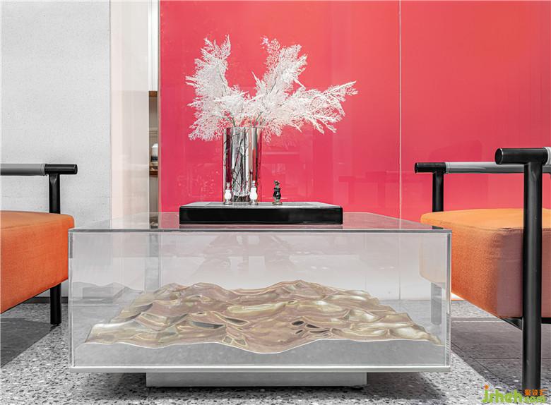 而靠近落地玻璃窗的一側(cè)則被室內(nèi)設(shè)計(jì)師注入了現(xiàn)代簡(jiǎn)約美學(xué)的氣息。茶幾的造型獨(dú)特,水紋狀的金屬片靜置在亞克力主體之中,流動(dòng)的趨勢(shì)凝固于剎那之間,藝術(shù)感油然而生;橙紅色的真皮單人沙發(fā)相對(duì)而立,在明媚光線下泛著溫潤(rùn)的光澤,耐人尋味。
