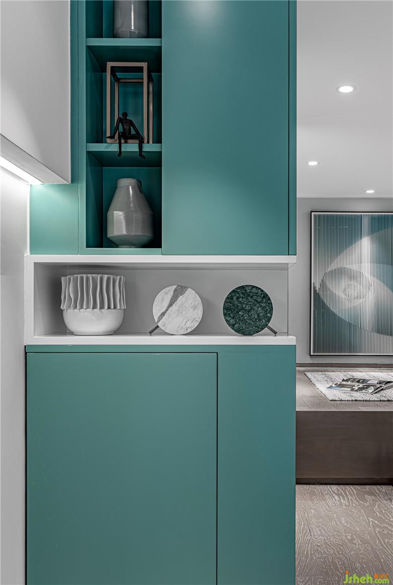 電視墻拐角處的收納展示柜,由一條蜿蜒的燈帶作線索,與樓梯另一端的壁柜遙相呼應(yīng)。心愛的收藏,采擷的片段,被貼心的收納系統(tǒng)細(xì)致妥善地安放。