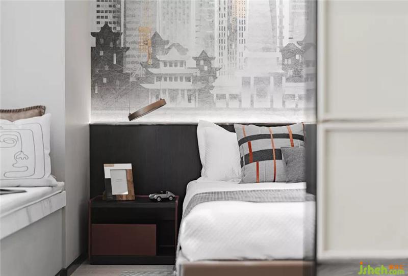 空間簡凝,不多假飾,低飽和度的色彩、簡單的紋理、搭配抽象意境的城市剪影 ,北京樣板房設(shè)計一切陳設(shè)落得妥當(dāng),只為無限拉近人與生活、與自然的距離。